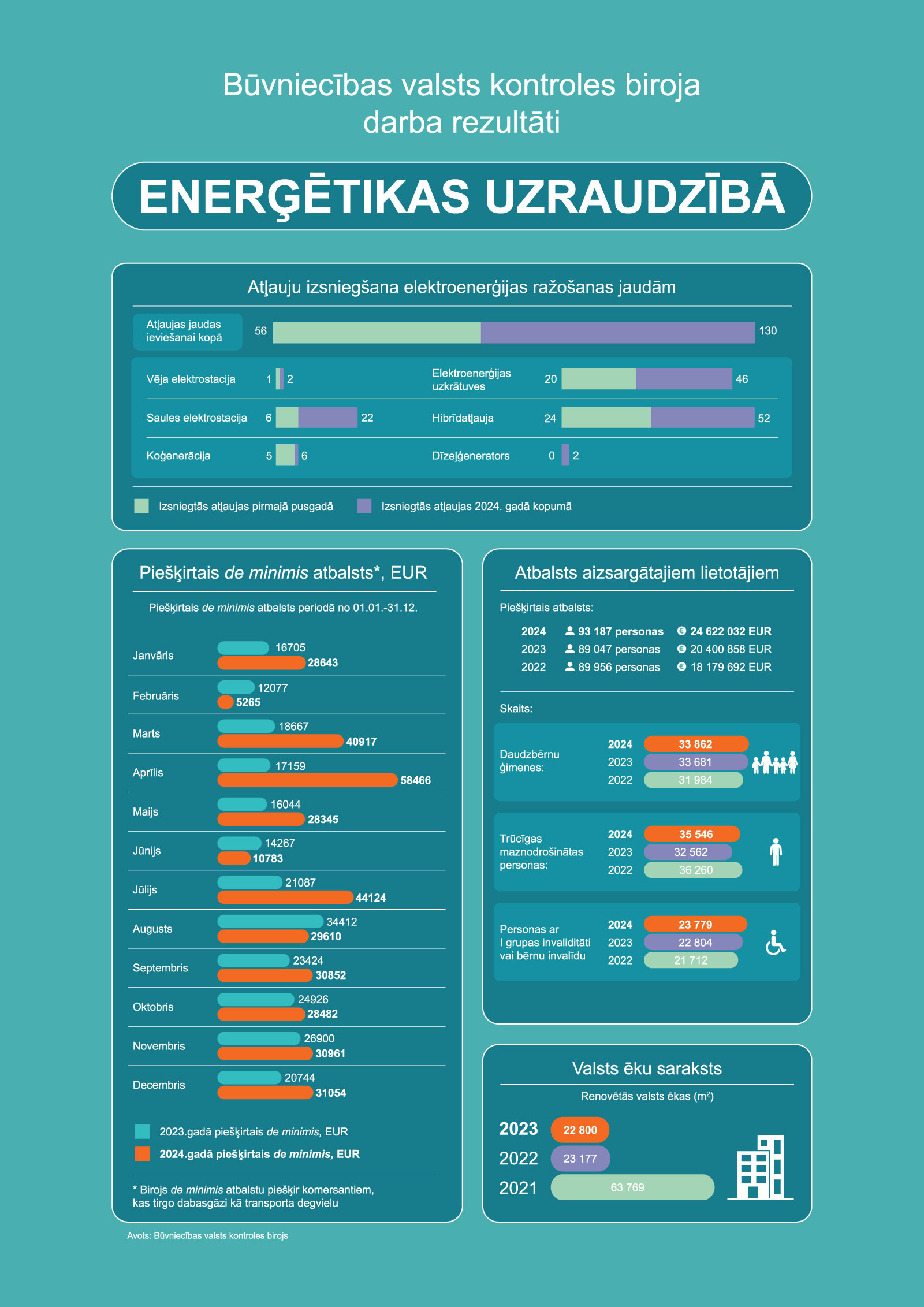 2024. gadā BVKB izsniedza 130 atļaujas jaunu enerģijas ražošanas projektu īstenošanai vai esošo jaudu palielināšanai. Atļaujas ietvēra 46 enerģijas uzkrātuvju (BESS) projektus, 22 saules elektrostaciju (SES) projektus, 2 vēja elektrostacijas (VES) un 52 hibrīdatļaujas, kas apvieno vairākus enerģijas risinājumus vienā projektā. Atļauju pieprasījuma pieaugums atspoguļo strauji augošo interesi par atjaunīgās enerģijas izmantošanu. Kopumā līdz 2024. gada beigām Latvijā bija aktīvas 744 atļaujas. Atļauju saņemšana gan vēl nenozīmē, ka atļaujā norādītā ražošanas jauda tiks ieviesta, jo projektu īstenošanu iespaido pieejamā tīkla jauda.