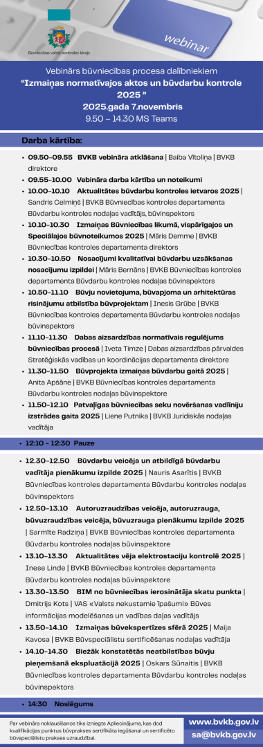 Būvniecības valsts kontroles birojs (BVKB) jūs aicina uz vebināru “Izmaiņas normatīvajos aktos un būvdarbu kontrole 2025”, kas notiks 2025. gada 7. novembrī no plkst. 9.50 līdz 14.30 tiešsaistē platformā MS Teams.