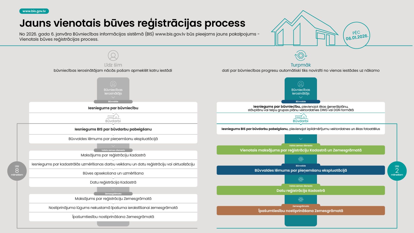 No 06.01.2026. Būvniecības informācijas sistēmā (BIS) būs pieejams jauns pakalpojums - Vienotais būves reģistrācijas process (vienotais process) jeb VBRP.